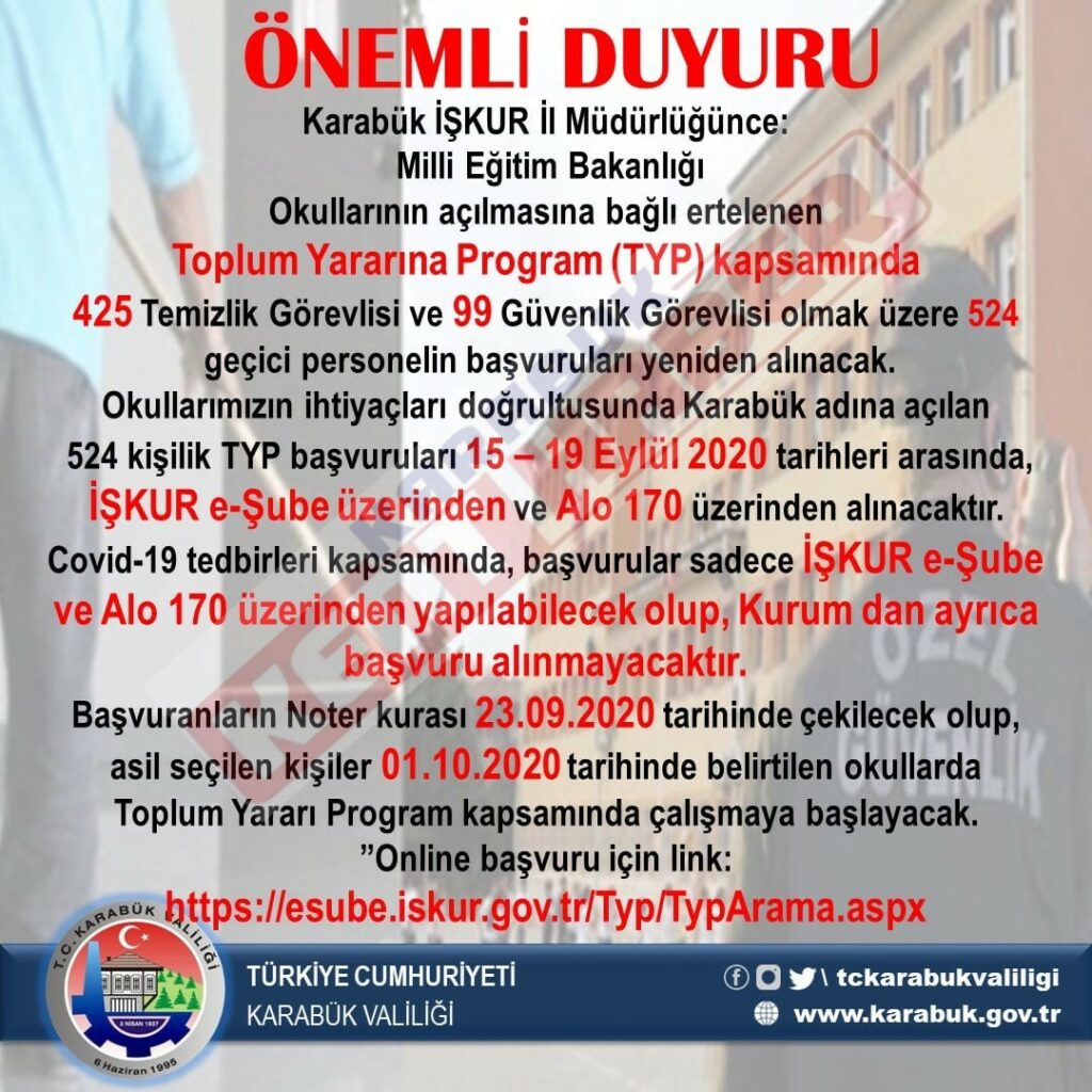 İl Milli Eğitim Müdürlüğü kanaatleri ve okulların ihtiyaçları doğrultusunda Karabük adına açılan 524 kişilik TYP başvuruları bugün itibari ile başladı. Başvurular İŞKUR E-Şube üzerinden ve Alo 170 üzerinden alınırken, Covid-19 tedbirleri kapsamında kurum üzerinden başvuru yapılamayacak.